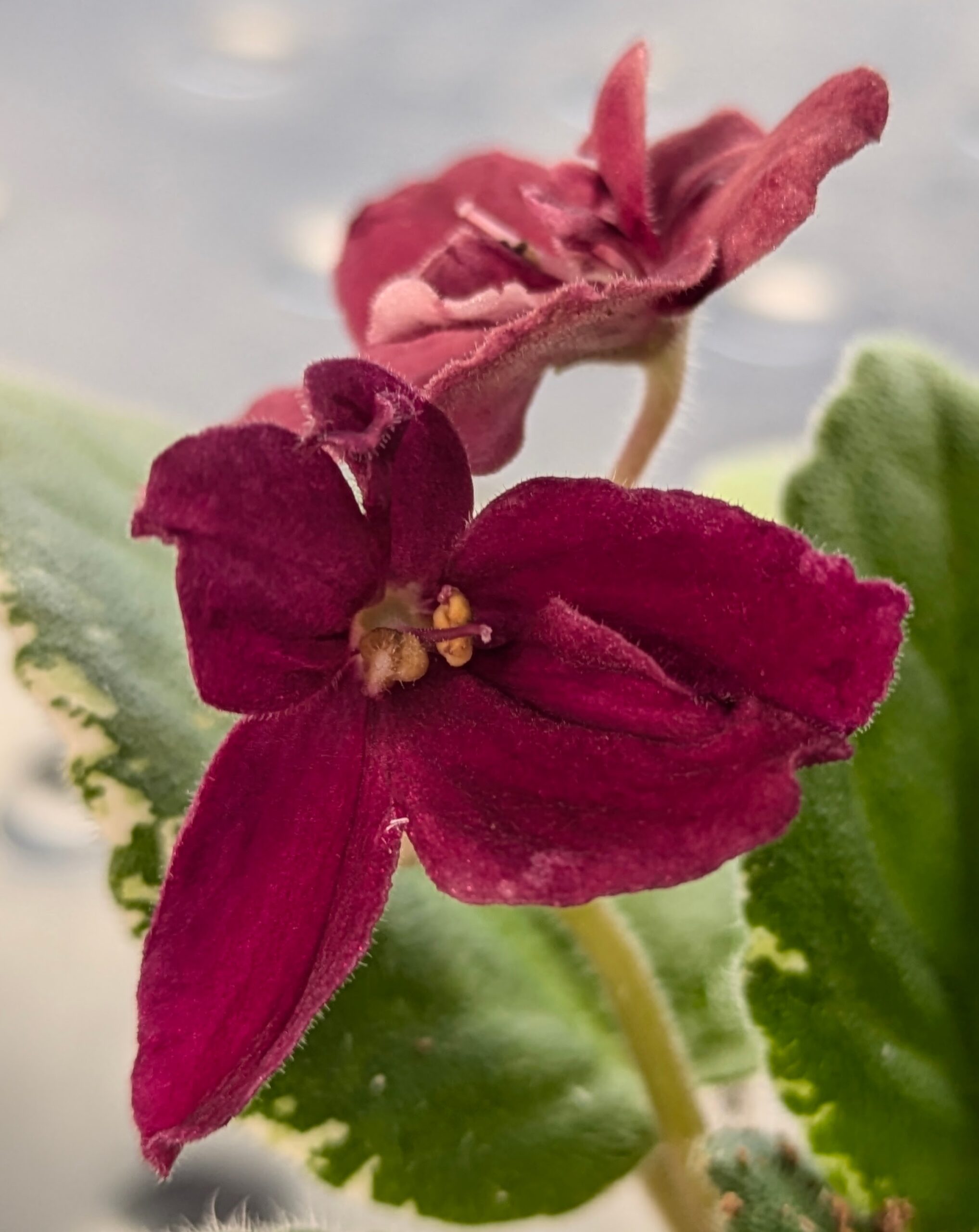 ** Mac`s O`Scarlet O`Hara (McDonald) Single to semidouble scarlett red pansy, variegated medium green and white. Semiminiature.